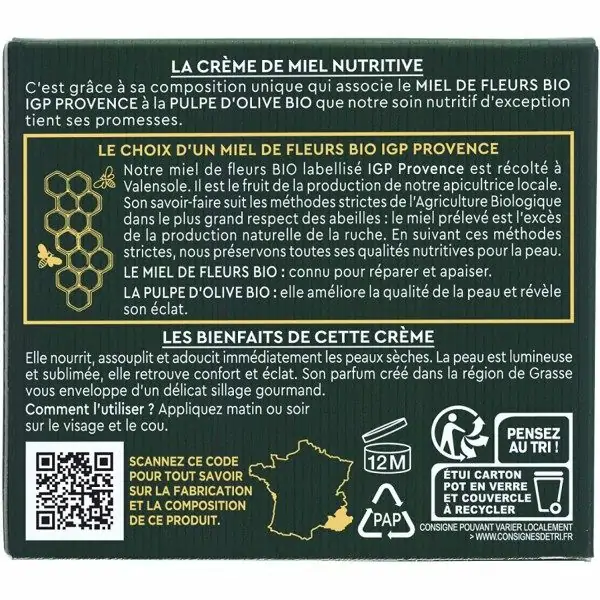 Crème de Miel Nutritive enrichie en Miel de Fleurs Bio IGP Provence et en Pulpe d’Olive Bio