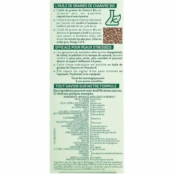 Formule enrichie en huile de graines de chanvre bio et en vitamine E naturelle provenant des graines de soja, Produit COSMOS ORGANIC certifié par Ecocert Greenlife selon le référentiel COSMOS – VEGAN, Tube en carton écologique certifié FCS