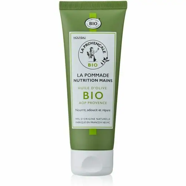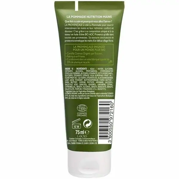 Crème mains formulée à partir d’huile d’olive BIO AOC Provence, de beurre de karité BIO et de glycérine d’origine végétale pour une action nutritive sans fini gras
