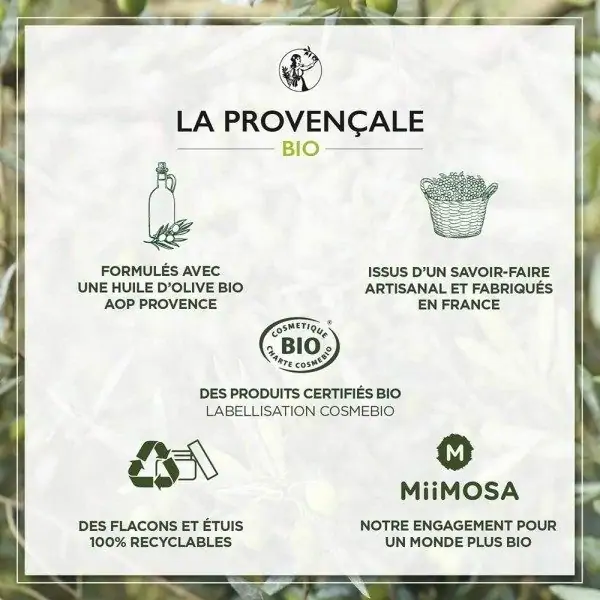 Soin fabriqué en France, Formulé avec 99% d’ingrédients d’origine naturelle certifiés Bio par Ecocert, Parfum délicat composé à Grasse, Voyage olfactif au cœur de la Provence, Flacon 100% Recyclable